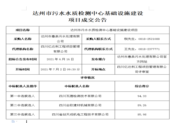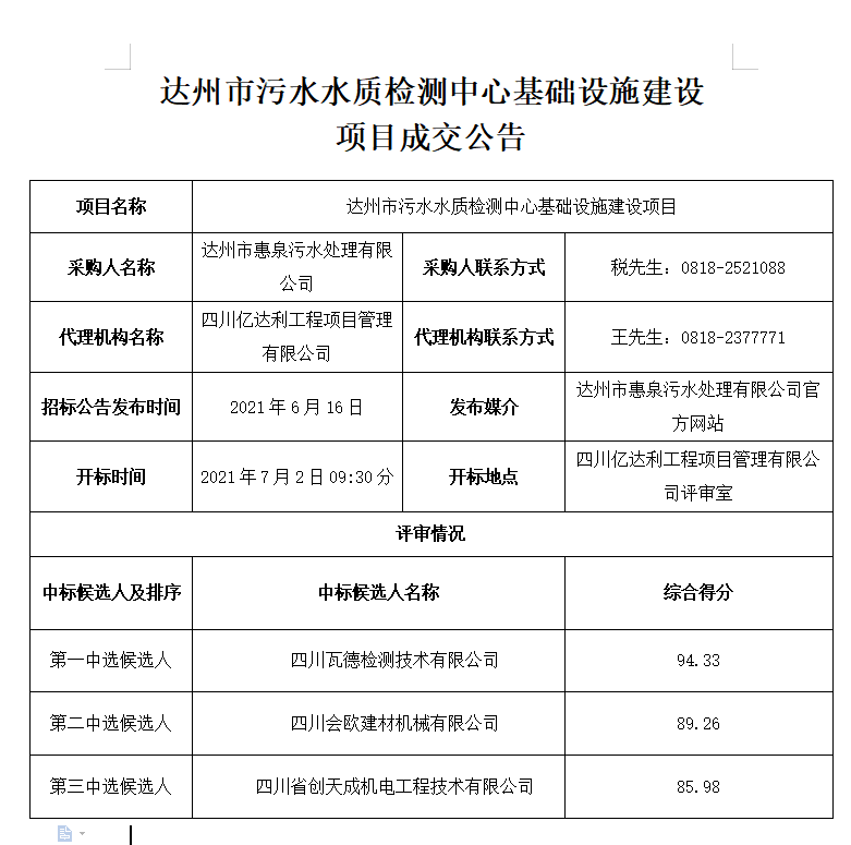 標(biāo)題:達(dá)州市污水水質(zhì)檢測中心基礎(chǔ)設(shè)施建設(shè)項(xiàng)目成交公告
